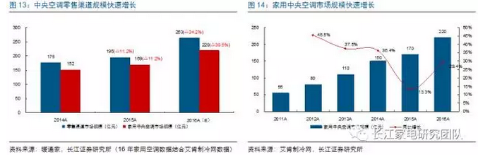 多聯機市場得以逐漸擺脫地產束縛實現高速增長的核心主因在于其零售渠道方面的良好表現,而帶動零售渠道需求釋放的主因一方面在于供給端中央空調廠商持續的終端零售渠道建設投入,另一方面也是最重要的,我們認為是需求端家用中央空調消費的逐步崛起;目前家用中央空調總體市場規模或已超過中央空調市場總容量的三分之一,且市場仍舊持續超過兩位數的高速增長,隨著高增長的家用部分在中央空調市場整體份額中權重不斷提升,其有望驅動中央空調行業重歸正成長。