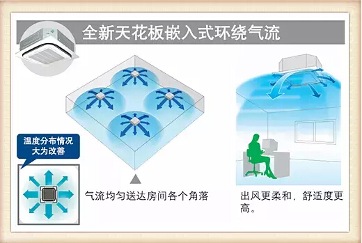 從機型來看,天花板嵌入式(環繞氣流)室內機,對應大開間和方形空間,氣流均勻,造型更美觀。溫度分布情況大為改善;天花板嵌入導管內藏式室內機,對應狹長型、U型和L型等不規則空間,有多種送回風形式,輕松實現與內裝的融合;自由靜壓風管室內機,對應不規則空間和挑高空空間,即使內裝格局經常改變,也能輕松對應。